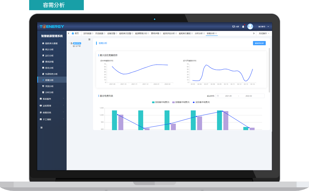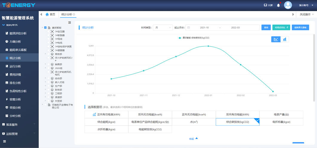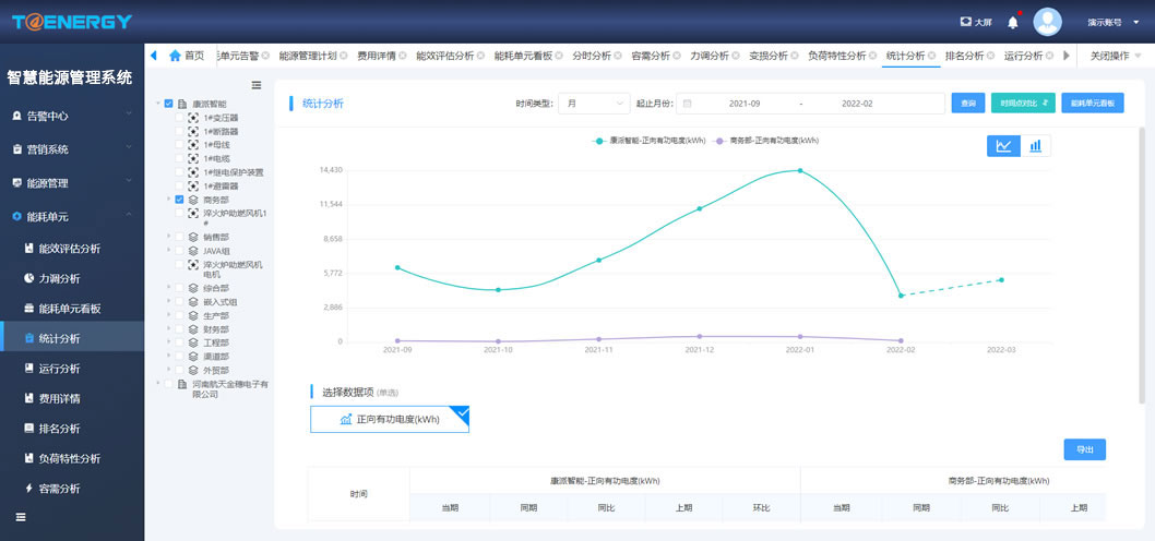 查看主要用能單元、用能設備的能耗值,提供同比、環(huán)比分析、能耗對比分析、能耗預測等功能,提高用戶(hù)用能管理水平。